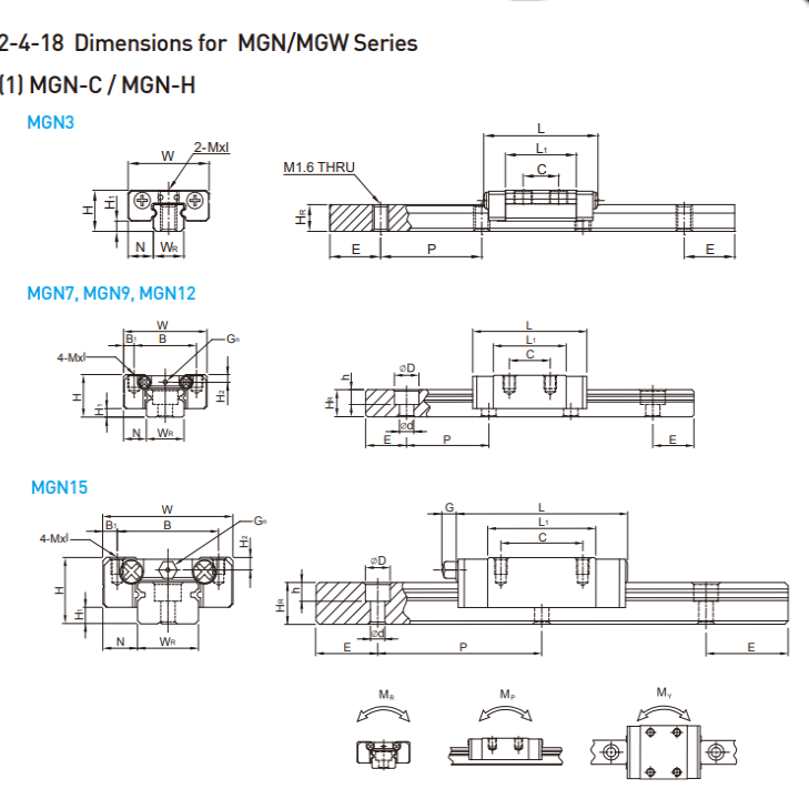 | MGN 9H | 10 | 2 | 5,5 | 20 | 15 | 2,5 | 16 | 29,9 | 39,9 | - | ⌀1,4 | M3x3 | 1,8 | 9 | 6,5 | 6 | 3,5 | 3,5 | 20 | 7,5 | M3x8 | 2,55 | 4,02 | 19,60 | 18,62 | 18,62 | 0,026 | 0,38 |
